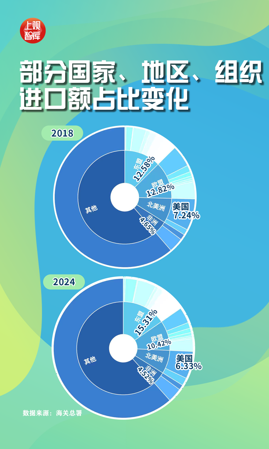 2018至2024年间,中国进口的来源地结构发生了显著变化。《区域全面经济伙伴关系协定》的红利持续释放,中国从东盟地区进口的占比从12.58%上升至15.31%;欧盟占比从12.82%降至10.42%;美国从7.24%降至6.33%。非洲的进口基数较小,但2024年进口总额已达83096371万元,同比增长8.2%,增速领跑很多发达国家。