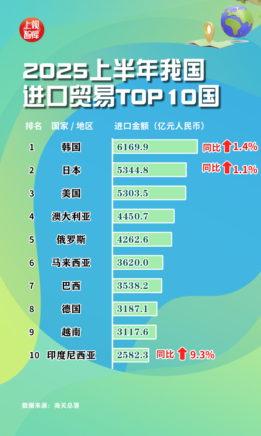 从国家来看,今年上半年中国的进口贸易伙伴前十强中,韩日超过美国位列第一、第二,印尼则以9.3%的增速后来居上。