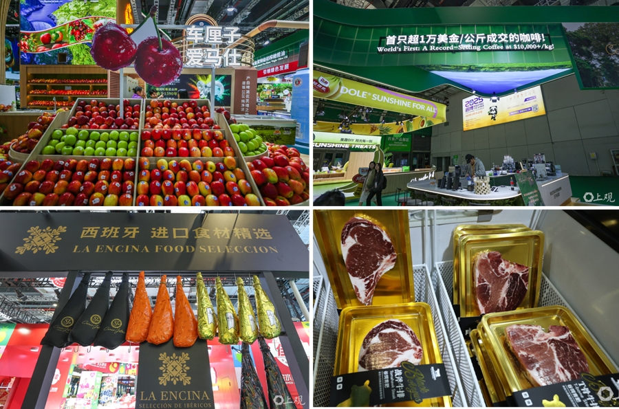 第八届进博会农食产品展区以“从全球农场到中国餐桌”为主题,西班牙火腿、1万美金一公斤的咖啡、战斧牛排、车厘子中的爱马仕等高端农产品悉数登场。解放日报 张海峰 摄